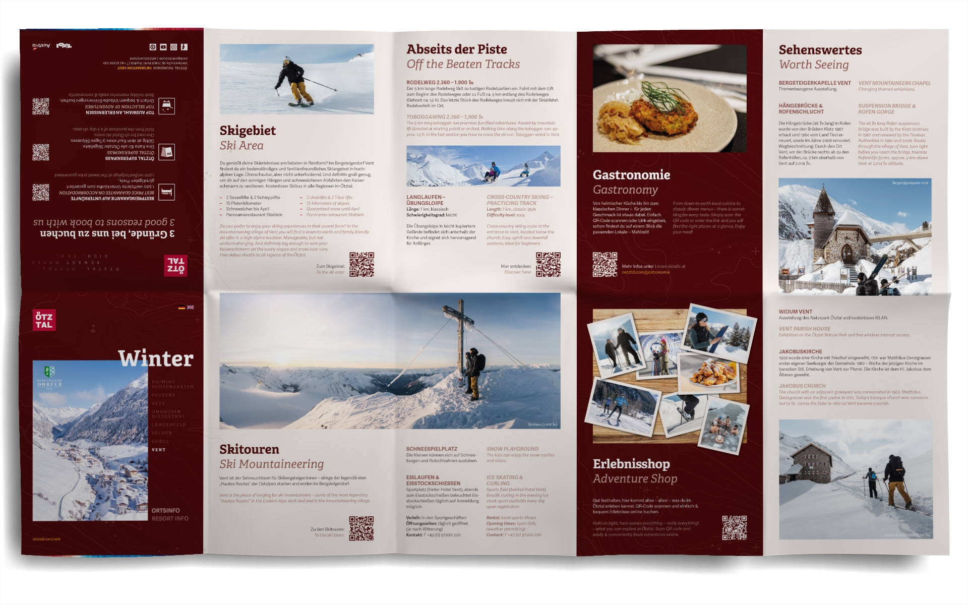 Alle Werbemittel werden zur einheitlichen Gestaltung in einer definierten Layoutstruktur angelegt. Teile dieser Struktur sind das Ötztal-Logo, das Farbband, eine Headline, die Hintergrundfarbe mit den Höhenlinien, Bilder und optional der Claim bzw. die URL.